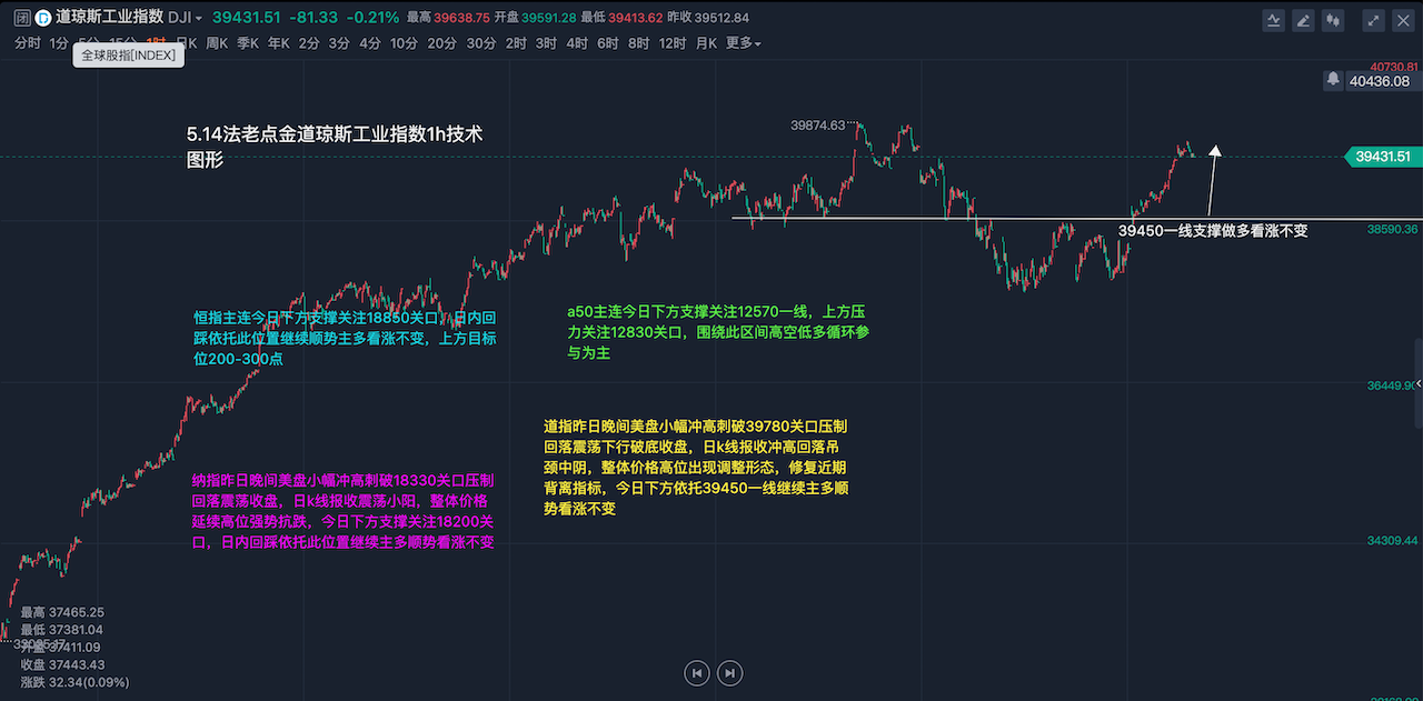 道指昨日晚间美盘小幅冲高刺破39780关口压制回落震荡下行破底收盘,日k线报收冲高回落吊颈中阴,整体价格高位出现调整形态,修复近期背离指标,不过目前中期均线依旧多头排列并向上发散,大周期延续多头强势运行节奏中,昨日短线调整不改变整体多头主方向,今日下方支撑继续关注39500-39450区域,日内回踩依托此位置继续做多,上方目标位依旧看破高,道指短期突破并站上日线级别20日均线上处于多头强势震荡运行节奏,任何回踩均是做多机会,继续保持顺势参与主基调不变,纳指昨日晚间美盘小幅冲高刺破18330关口压制回落震荡收盘,日k线报收震荡小阳,整体价格延续高位强势抗跌,今日下方支撑关注18200关口,日内回踩依托此位置继续主多顺势看涨不变,纳指短期多空强弱分水岭关注4小时顶底转换位17800关口,日线级别企稳此位置上方继续保持震荡上行为主,保持顺势参与主基调。具体策略盘中实时给出,注意及时关注。