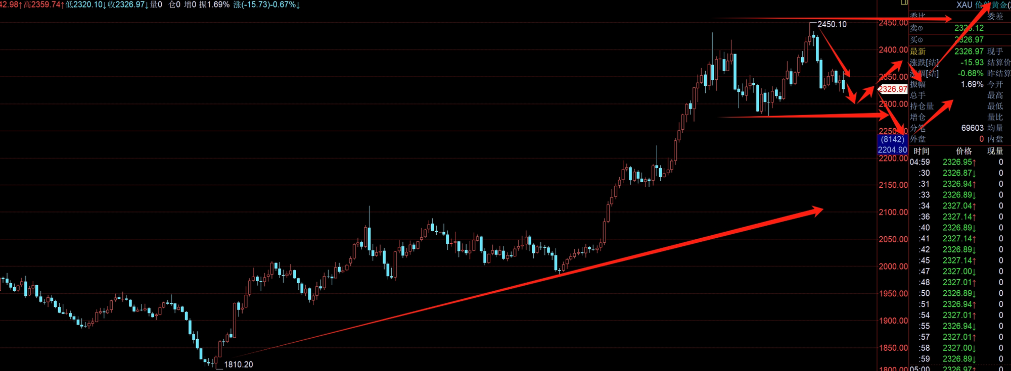 而技术面上,本周黄金整体是冲高回落,而且是在连续大跌两天之后,出现了3天反弹,之后开始走弱,这个是标准的看空行情,而从当下结构来看,未来如果下破2277的支撑,整体就是开始看空,预期2450就是未来的顶部,而不是等明确的降息时间,而未来反弹就是持续高空为主,而未来预期28号高点之后震荡看空到5号,之后震荡到11号,震荡核心关注11号转折,之后看到24号更多的以日内的策略为准:
