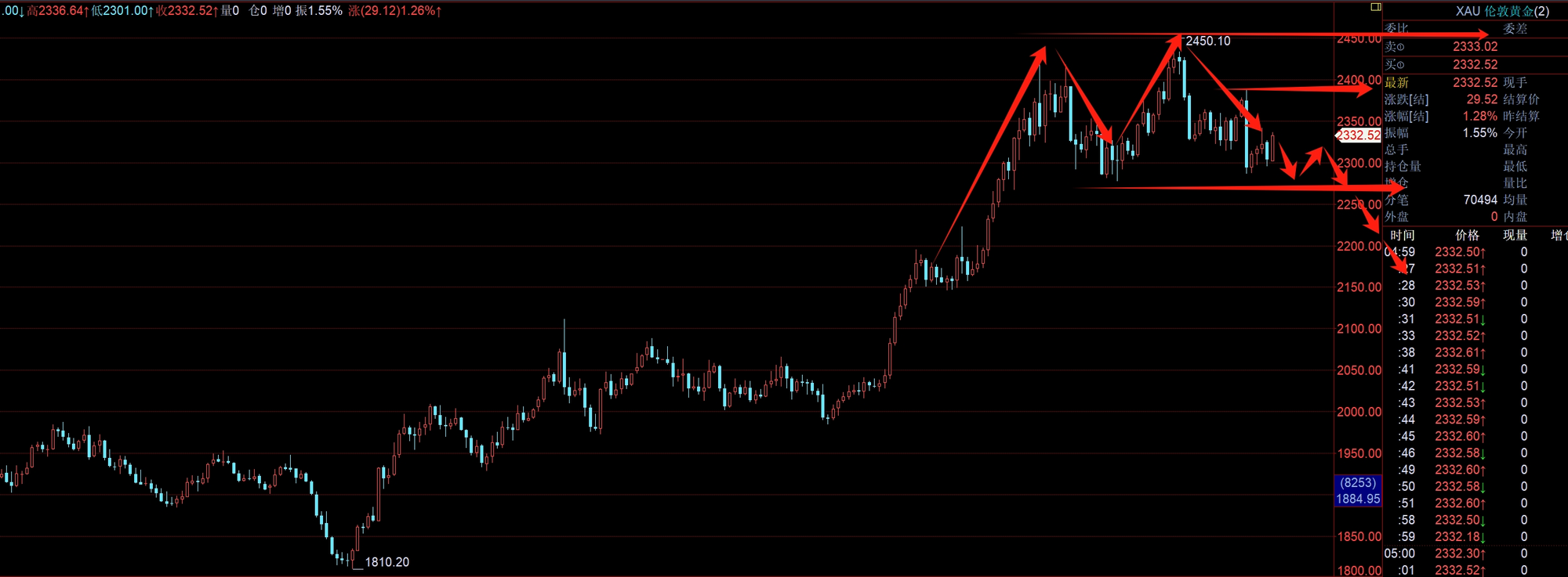 ; ; ;以上因子就是造成黄金白银持续反弹的核心关键,而最关键的因子还是因为CPI下降到3.3%,低于市场预期的3.4%,而降息预期的升温才是黄金白银回弹的核心逻辑,而之前我也说了如果下破2277的支撑,2450就是未来的顶部,未来就是确认进一步的看空,但当下的结构未来不排除还将二次探顶这个可能!这点等会我们再进一步的分析!