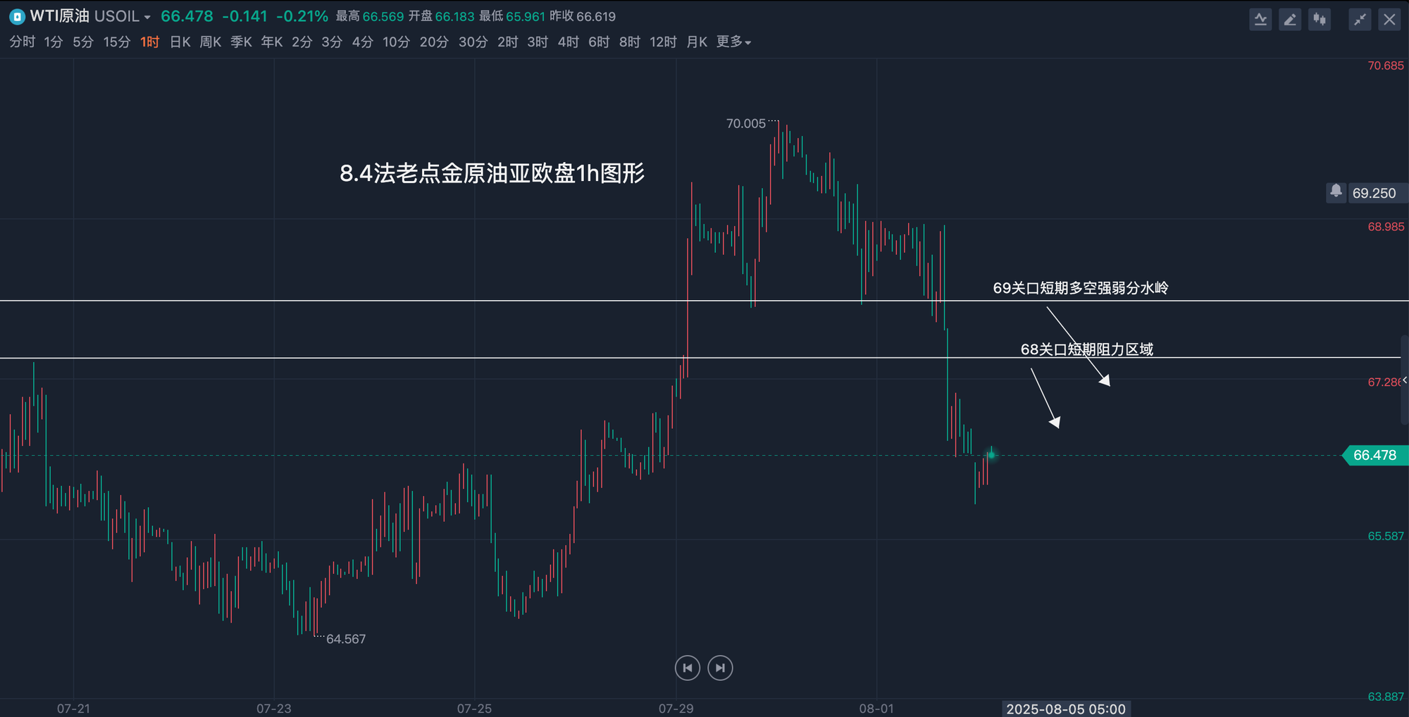 08/04 10 : 098月4日【黄金原油】亚欧盘:黄金3342多一单到底直接扫止盈,今日回踩依托3338继续主多顺势看涨不变,原油上周五承压69.5关口压制回落震荡下行破底延续弱势空头形态,今日反抽依托68.3继续主空顺势下看回落不变