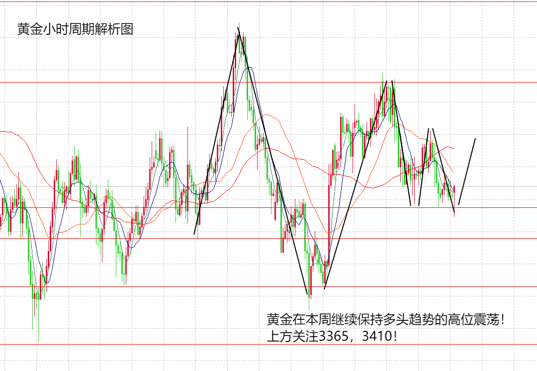 先下结论,本周维持多头趋势的高位震荡,以低多看涨为主,上方关注3365,3410,下方关注3330,3310。上周黄金在五个交易日中,周一,周二震荡下跌,走出低点在3330附近,周二公布CPI数据后,确定低点开始上涨走反弹,周三,周四出现上涨空间,周五低位震荡有调整,并没有太大的行情。全周波动不大,基本走法是多头趋势的高位震荡。那么,在变动不大,市场影响较小的情况下,本周大概率也是维持多头趋势的高位震荡,上方关注3365,3410两个高点,其中破位3365,再看3410高点。从技术面来看,日线周期收线还是在布林中轨附近,上下都有可能,由于暂时保持多头趋势不变,所以,上涨的可能性比较大,上方空间可以看到前高3410附近,而H4周期经过暂时偏弱,一直没有破位3365之上,所以相对来讲趋势力度还没有走出来,不过也难以走出较大下跌空间,早上的下跌快速反弹,可以看到H4布林收口,均线粘合,所以,很明显本周初是震荡走势,先看慢涨至布林上轨3365附近,所以,周初黄金还是尽量做低多看涨。如果周二,周三破位3365,那么,H4布林上轨开盘,再结合日线周期的变化看多头的延续。因此,周初对黄金的看法非常简单,再多头趋势下,做低多看上涨空间。对于周一行情而言,黄金快跌快涨,多空势均力敌,不过还是多头占优,所以,日内交易的话还是低多看涨,下方支撑在3330附近,上方关注3365高点得失。