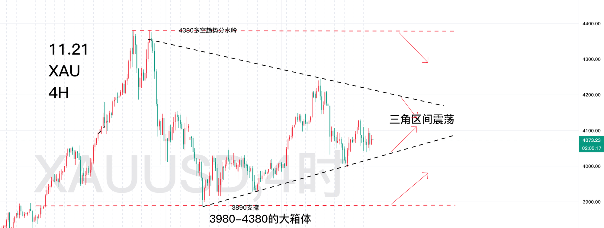 第二:箱体震荡:上面是4380的压力,下面是3890的低点支撑;这个箱体是趋势性的箱体,破位4380或者跌破3890的位置,则是选择趋势破位跟进的思路对待!