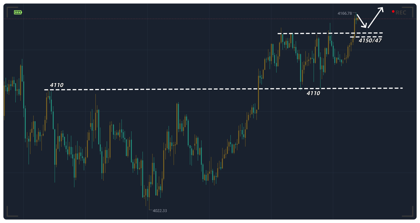 日线级别来看,昨日十字修正形态未终结反弹趋势,反而随着价格突破上周强调的4110-4022美元区间,形成明确上行突破,且昨日两次回测4110美元完成顶底转换,确认4110的支撑作用。