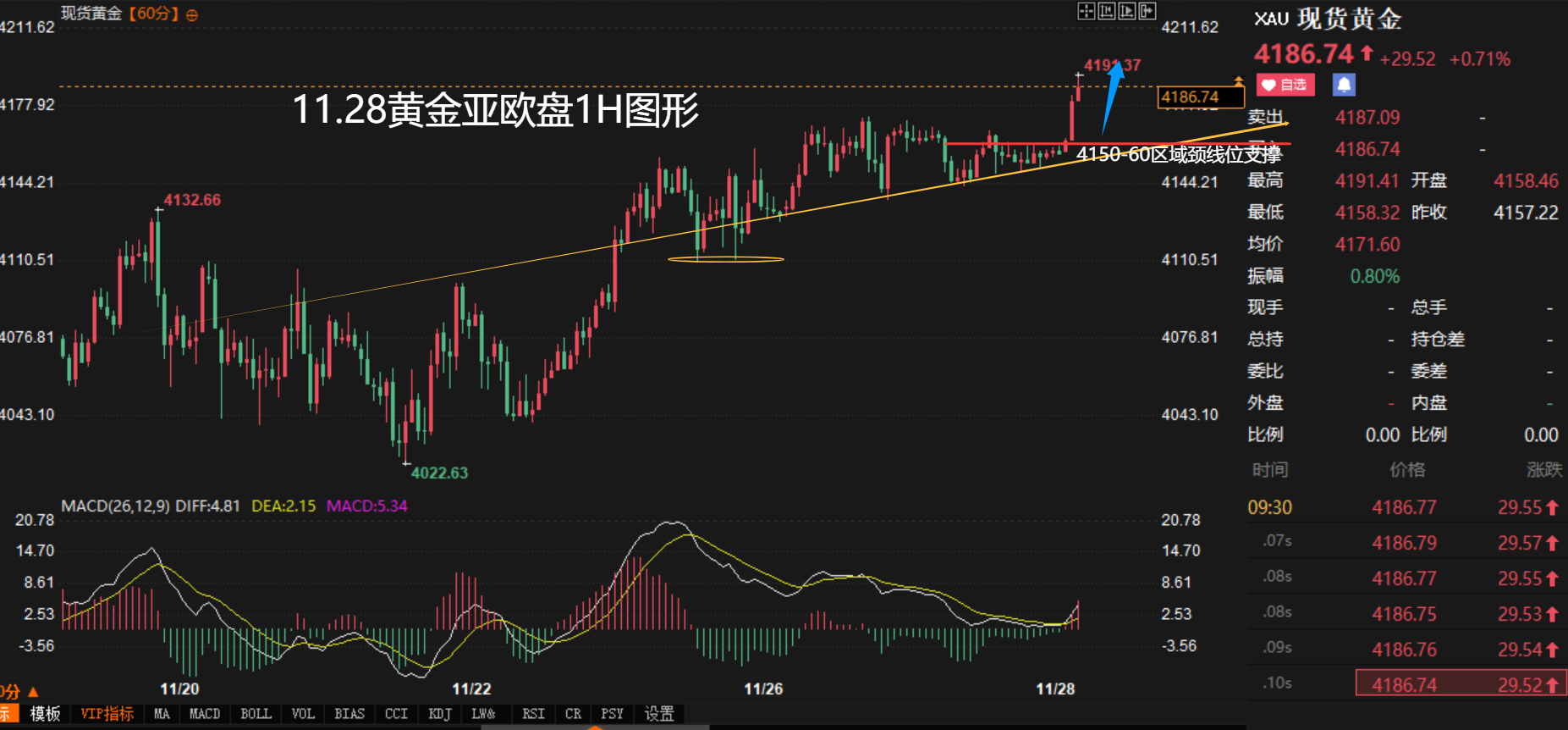 11/28 09 : 4711月28日【黄金原油】亚欧盘:黄金昨日4148多遗憾未能进场,短线延续多头强势极强单边形态,今日回踩依托4155关口继续主多顺势看涨不变,原油昨日依托58关口延续多头反弹上行,今日回踩依托58.3继续先多再看反弹回升