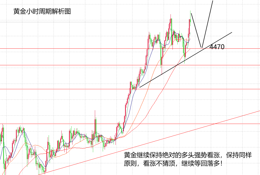 市场的基本环境不变,所以看待黄金的方式不变,还是要强调,黄金一定是绝对的强势,看涨不猜顶,虽然某些月份是震荡,某些时间点有调整,但大趋势,大方向丝毫没有动摇。因此,在强势中,一定是坚持做多看涨。本周目前周一单边上涨,周二先涨后跌,再涨,z周三同样是先涨后跌,最低在4450,这个走势和和价位跟山海预测的一样,在绝对强势中,不能追高,而是等调整做合理的多单,所以周三给出的4450多单,拿到了周五开盘,现在开盘,黄金继续刷新高点,上涨至4528附近,只要市场开盘,每天都有一个新高,可见趋势的力量是多大。那么,周五维持前期的看法不变,继续看好黄金的多头表现,但也不追高,等待黄金调整做多,特别是亚欧盘冲高后欧美盘可能有回落空间,今天技术面的支撑在4460附近,看今天是否能到此点位顺势多,上方先看前高,当然,今天周五,最好是建议看一个短线的趋势空间就可以,尽量不留单过周。