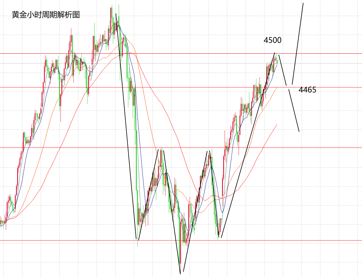 老规矩,先看图,近期一直强调的图形结构上的头肩底,双底形态已经完成,这波从4300到4500的上周,基本全部都抓到了,接下来就需要看这种结构会不会被本周数据冲击破坏。首先,还是要强调,当前黄金的大趋势,大方向没有变,上涨到4500也不是顶部,前面的顶部4550没有试探,也没有像样的调整空间,所以,在结构中还没有形成明显的顶部形态,那么,就不应该看空或者看调整,所以,在数据影响之前,黄金还是要继续保持节奏,做回落多。从技术面来看,日线在本周的连阳上涨才开始,目前状态正盛,周三继续收阳就要去4550前高,而H4已经形成了单边均线上涨的状态,5,10日均线的支撑非常明显,今天下方的支撑在4475,4460,这两个点位不破依旧可以顺势做多,特别是4460是连续上涨后的强弱关键点,这个点位不破可以坚决做多,看涨逐步看到4520,4550。当然如果今天意外破位4460,也有可能像山海讲过的一样,周三回出现调整空间,到时候再看调整空间的大小。至于今晚的ADP数据是重点,前值是-3.2,市场预测值4.7,相较而言数据差很大,美就业率升高,向好市场,间接的可能利空黄金,那么,就要看具体的调整力度了。