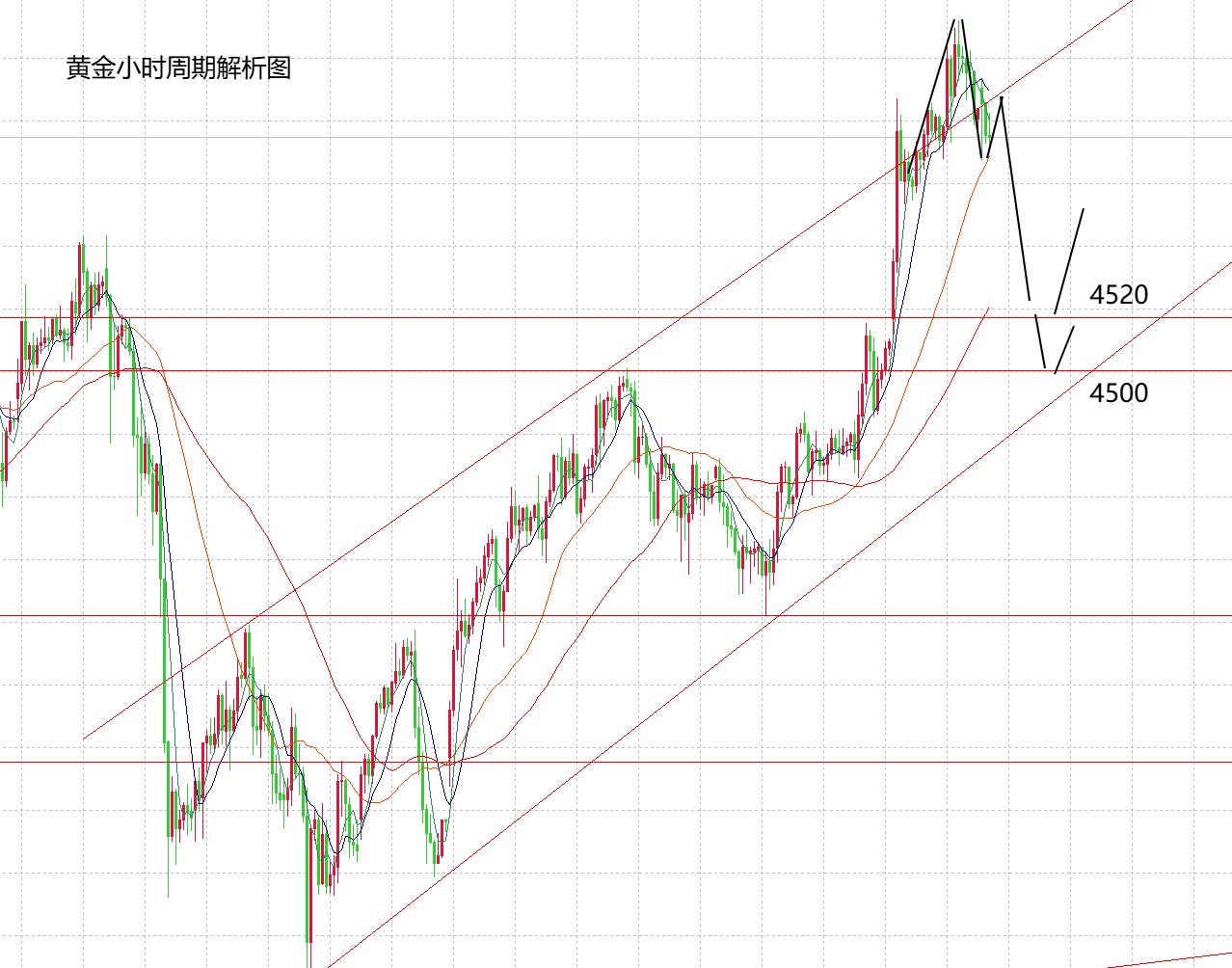 老规矩,先看图,图形比较明显,上涨后回落有顶部形构图,今天要注意周期变化!在黄金阶段性突破4550后,连续一个交易的上涨,现在黄金已经走高至4630,也就是说,黄金向上突破了80美金,其实这个力度不管走多少都合理,属于市场正常的避险价值体现,前面强调的,黄金上涨后不猜顶,也就基于这个原则。那么,在原则之内,如果要出现调整空间,也需要做出应对策略,周一的大涨,技术面日线表现不明显,但H4周期开始有顶部形态,或有一波较大的调整空间,目前连阴下行确定,今天可能会继续走低至4550,4500,如果这样走出来,那么,日线收阴,周二调整后,本周黄金就是一个高位震荡了。所以,自4630开始到4500这波大空间也需要关注。山海建议,从今天开始可以尝试性做高空看回落空间,下方至少看到4520/4500。另外,今天有美CPI数据公布,这是体现美市场经济的重要指标,也是1月美联储是否降息的重要风向标,需要着重关注!