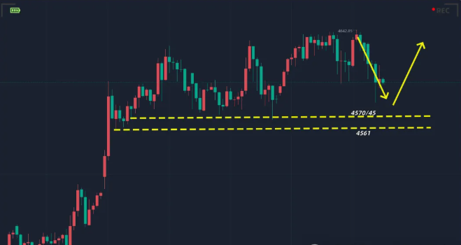 从技术面来看,多头强势特征依然显著:周一破高之后,周二、周三连续两个交易日均刷新历史高点,高点持续上移的态势彰显市场重心稳步上移;且每次回调过程中均收出明显下影线,探底回升的走势反复出现,充分印证下方支撑的强劲韧性。对于今日操作,重点关注4570-4575区间的关键支撑带,这一区域是前期多次验证的强支撑区间,同时需将周一修正低点4561作为多头防守的分界点,依托该支撑位继续看上行延续。