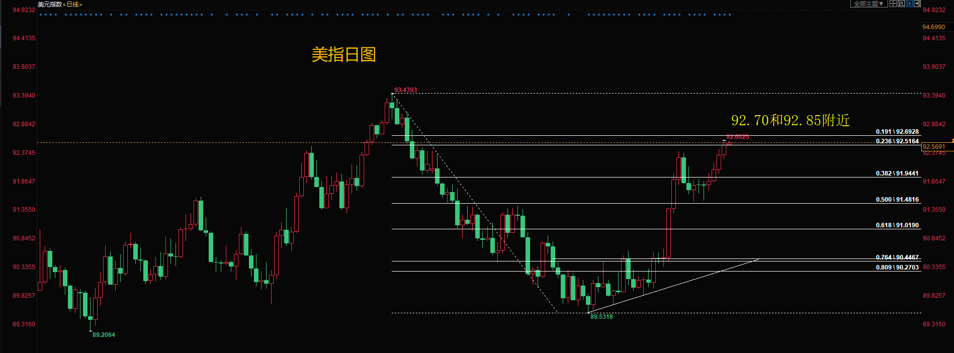 使用黄金分割线可以看到80.9%的分割线处的价格区在92.70和92.85附近。