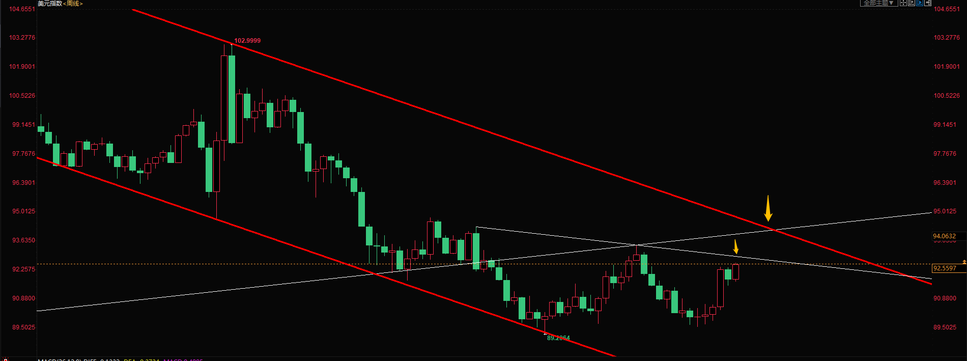 我们把这个环节放大。就会清晰的看到美元指数处于大周期的下降通道当中,黄色的箭头有两个标识。