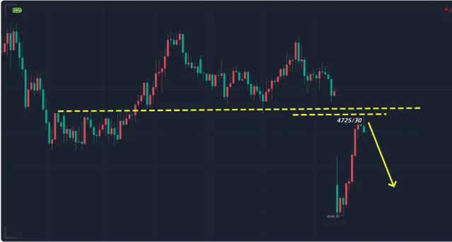 不过由于早间回撤的幅度过大,我们并不一定非要等到4734这个位置再做入场,我给大家的建议是,在4725-4730这个位置直接看空,直接放空看回落,下方重点关注4680、4660-4650这样的支撑情况,以此作为空单的止盈参考。至于是否能去做多,我们需要看亚盘的回落情况,等亚盘走势明朗之后再做考虑。