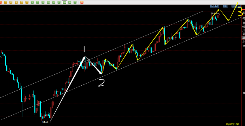 06-07 09:34上周原油在站上67.00之后出现了5连阳的走势,说明多头依旧牢牢掌握了市场的主动权,并且在上破新高之后有加速上行的可能。因此今日继续看多,短期的上行通道也是非常完美,上行途中的回踩都成为比较好的买点,只要考虑在回落靠近趋势线下轨时继续买入就是非常成功的。日内建议69.20附近买入,风控68.70下方,目标70.00~70.50。结构上处于3浪上行阶段。图片为原油2小时图