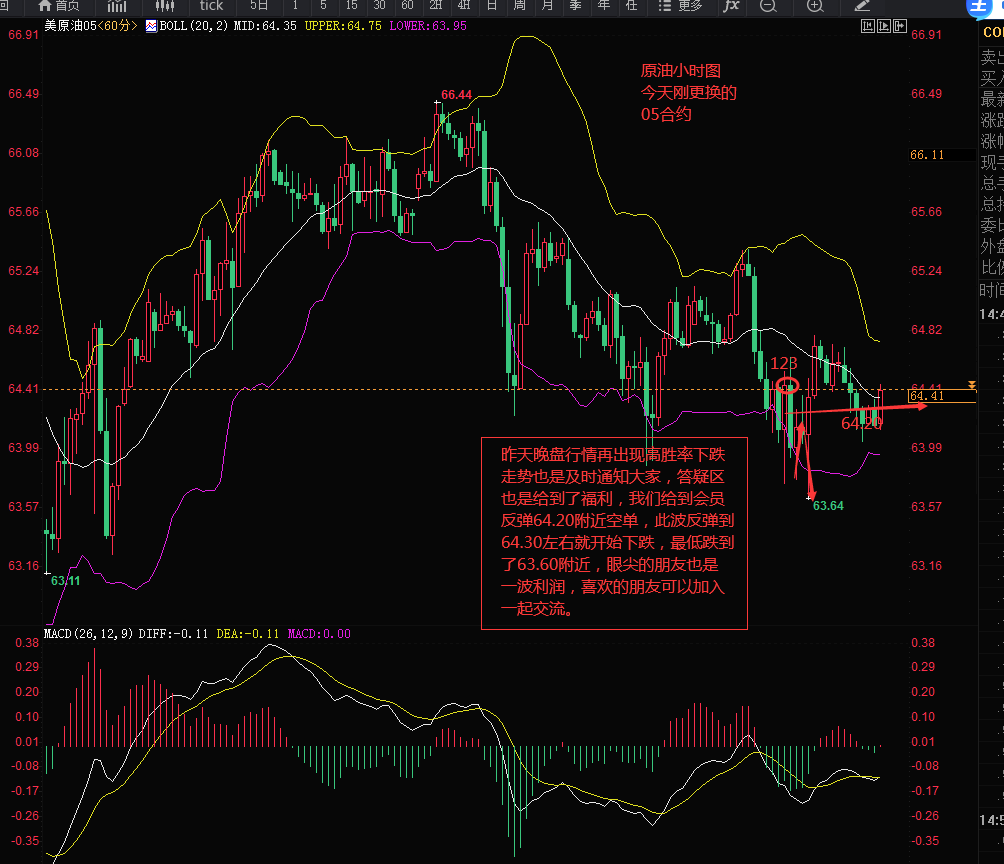 昨天晚盘行情再出现高胜率下跌走势也是及时通知大家,答疑区也是给到了福利,我们给到会员反弹64.20附近空单,此波反弹到