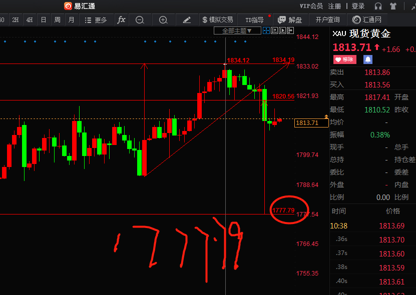 07-19 10:41黄金我们预计在1818附近做空 下方先看1777.8附近的支撑 若是筹码对称后依然下跌就是趋势的反转行情到来了 如图所示: