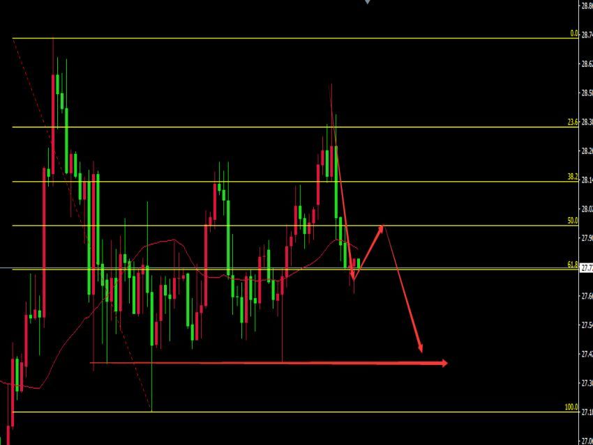 06-02 18:55白银日内的走势和黄金是相似的,也是延续了昨日的下跌走势。需要注意的是白银下跌到27.65附近有一定的支撑,支撑力度还是有些强的,需要关注市场在这一区域的有效突破,才能进一步走低。白银美盘先看反弹,短线建议28.00~28.05一线考虑做空,风控点28.25上方,目标位27.60和27.40,结构上白银大概率已经身处C浪1的下跌趋势中。图表是4小时图