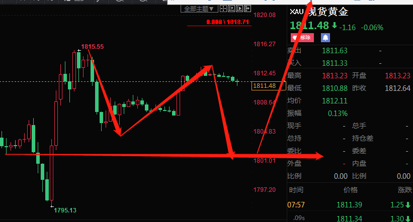近2个交易日黄金上蹿下跳重回以前的股价通道线内依然保持震荡的姿态 给我们在交易上带来难以把握和梳理的尴尬境界 策略上我们保持耐心等待行情的日内波幅足够大以后给出稳定的形态再操作即可 切记冒进和偏执 一味看多和看空都是不可取的 行情振幅有些大虽然难以把握 但是我们只要有足够的耐心等待行情的波动 波幅够大 形态出来后再介入还是可以捕获到一些蛛丝马迹 策略上我们准备先逢低做多 高位再做空即可 我们可在1801附近介入多单 1829附近介入空单 这是我们预想的操作节奏