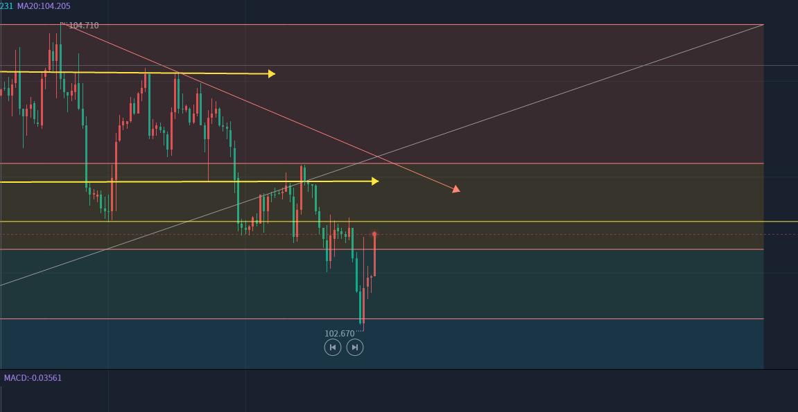 06-15 10:39美元指数如预期探底回升, ;日线收长下影阴线,今日关注102.2-103.4区间。
