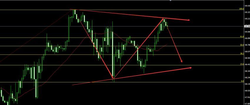 06-04 18:276月第一周的交易又将结束了,这周你收获了什么,交易技能有没有得到提升,可以自我反思总结一下。这周美油整体走势震荡上行,最高触及69.35美元。EIA原油库存数据录得大幅减少500多万桶,对于油价是有一定支撑的,但是数据出来后,原油走势和数据利多是相反的。说明油价要再次走高还需要时间。此外,美伊谈判尚未取得实质性进展,暂时不会对油价产生强烈冲击。原油需要重点关注69.30~69.40区域的阻力,如果持续受阻那么回落不可避免,突破这一区域才会去冲击70.00甚至于去至更高的位置。,因此晚间先以看空为主。美盘短线原油策略请关注图灵WX群的公告。(图灵波浪理论)图片是原油半小时图