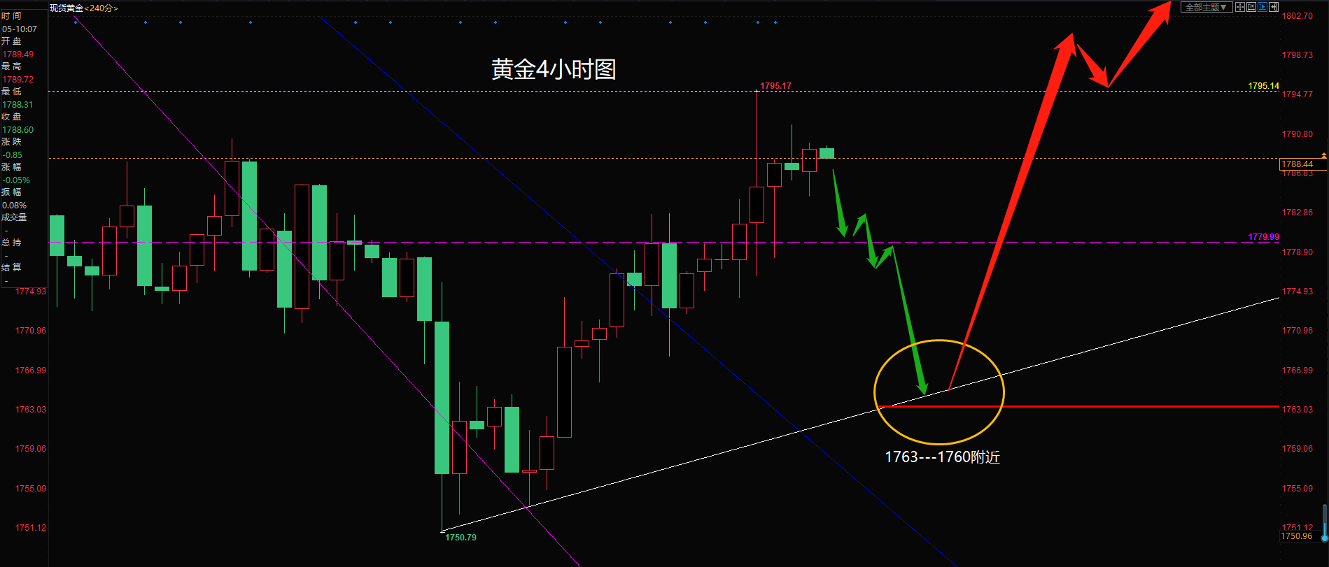 黄金自从1750价格起涨到1795这个阶段可以称为是 ;黄金第5浪结束之后的a浪调节浪。a浪上涨的(向上的),b浪一个的下跌的(向下的),向下是干什么?寻找底部支撑,这句话说的比较文明的!露骨的说就是:1、空头资金头寸逃命的时机;2、诱空行为,准备傻一波。