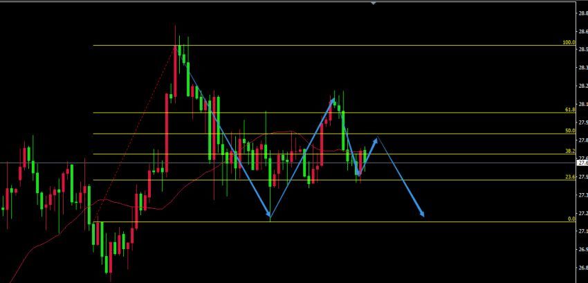 05-27 18:56从技术形态上看,白银近期的走势要远远弱于黄金,白盘区间小幅震荡。日内黄金的走势引导着白银。白银昨日美盘间反弹到28.20一线的阻力位转向下跌,这个压力我们在昨日的晚评中也精确的给到过,现在得到了测试。今日美盘白银的操作思路也是触碰阻力考虑去做空。短线白银美盘需关注27.80~27.90一线的压力,反弹到这一区间可考虑入场做空,目标位27.40和27.20。图表是4小时图