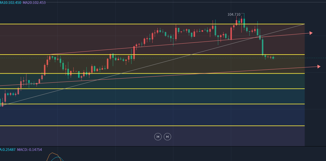 06-02 10:06美元指数昨天大阴,今天还有一跌,但是周线支撑103.1附近,要防止行情探底回升,晚间非农接近104.1空,接近103.1多。 ;