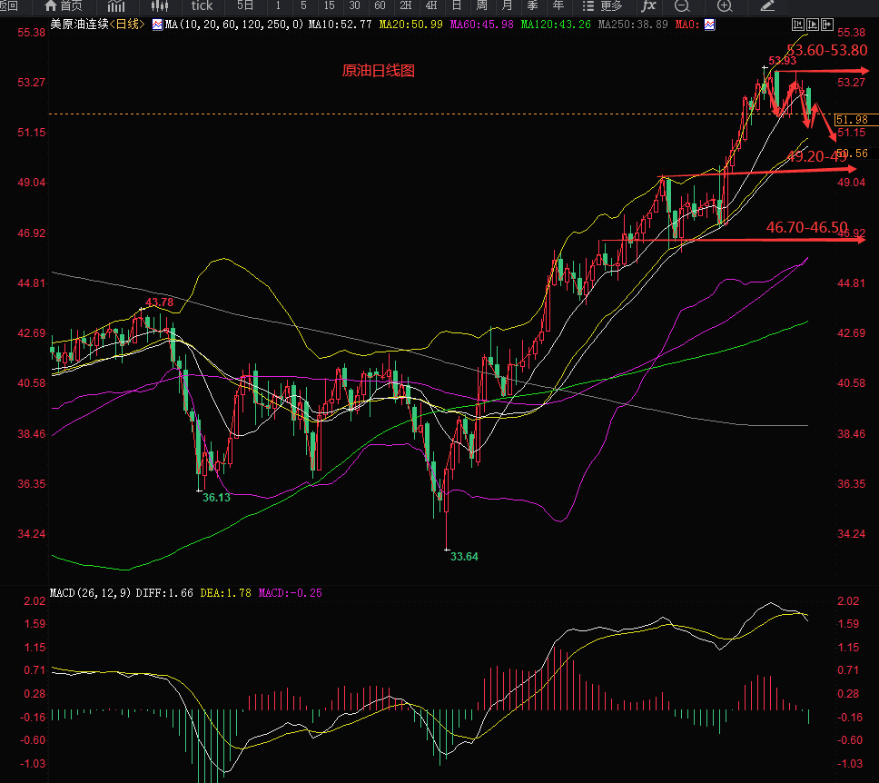 原油从日线级别看,本周呈冲高回落走势,和上周的走势差不多,54关口仍没能完成突破,可以减上方的压力逐步递增,日线形态形成下降三法则,照目前走势看,回调仍在进行中,我们也是提示53.80附近做空,只有在51.65附近做了一次多单,下周继续回调的概率较大,重点关注49.20-49的支撑位,以及46.70-46.50的第二重要支撑位,其实日线布林带中轨也是一个值得注意的地方,按照这正常走势此处也会有一波反弹;上方压力位线参参考53.60-53.80,以及55的强压力位,当然只有在突破54的情况下才能进一步测试55关口,若是跌到46.50附近(上下0.2美金)也是我们做中线的位置,上看200-300点,55的中线空单位置不变。53.80附近仍是短空的好位置。(仅供参考)
