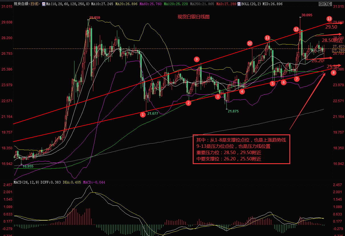 现现货白银从日线级别看,本周五个交易日呈现先跌后涨的格局,周二冲高,最终在27.955处遇阻后大幅下滑,周五一度跌破布林带中轨的支撑位,最低跌到了26.139,随后行情快速拉升,短线形成一个V型反转走势,日线宽幅震荡收涨,其中盘中也给到大家提示。技术面上布林带收口,各周期均线开始往水平方向运行,指标MACD在0轴上方死叉,但是空方动能变现不强,短期看白银走势依然偏震荡,重点关注上方压力位28.50和29.50附近的压力位,以及26.20和25.50附近的压力值,第二支撑位和第二压力位都是我们中线空单的位置,到了就果断进场就行。(个人建议,仅供参考)