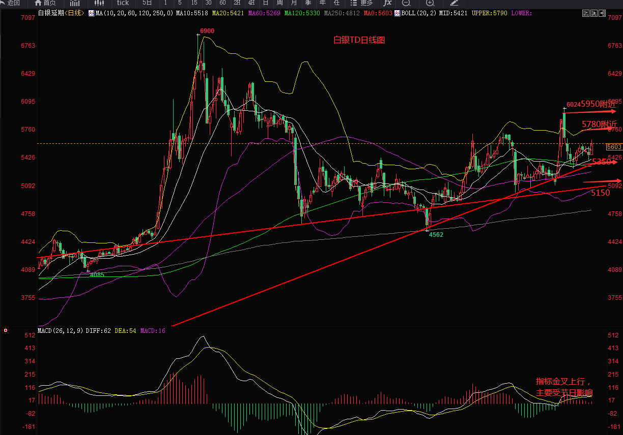 白银TD技术面依然参考现货白银,我们要注意的就是下周的重要支撑位5350,5150,两个支撑位也是做多的好时机,5150附近布局中线多单,看400-300点。上方压力位5780-5800附近,以及5950附近,当时两个压力位都是做空的好时机,5950附近就是中线空单,目标300-500点。(还有特别注意的是我们的压力位和支撑位都有10-20点的浮动,不可能掐的那么死,做的时候灵活一些)