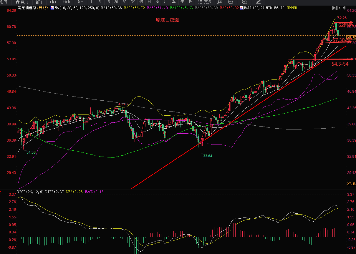 原油从日线来看,本周一和周二进行整理,周三继续上涨,价格一度突破62美元关口,这个主要受美国部分停产的影响,周四到周五开启回调;技术面,布林带三轨朝上运行,各周期均线形成多头排列,K线跌破10天均线,MACD快慢线位于零轴上方聚拢,且红色动能减弱,整体看依然运行于多头趋势内。4小时来看:布林带开始走平,且有开口下行的迹象,K线运行在布林带中轨下方,从形态看短线有继续回调的动能。下周重点关注62以及63附近的压力位,下方支撑位参考57.30-57,以及54.30-54的支撑,54附近也是我们做中线多的位置,上看300-500点,57附近仍是短多的好位置。(仅供参考)