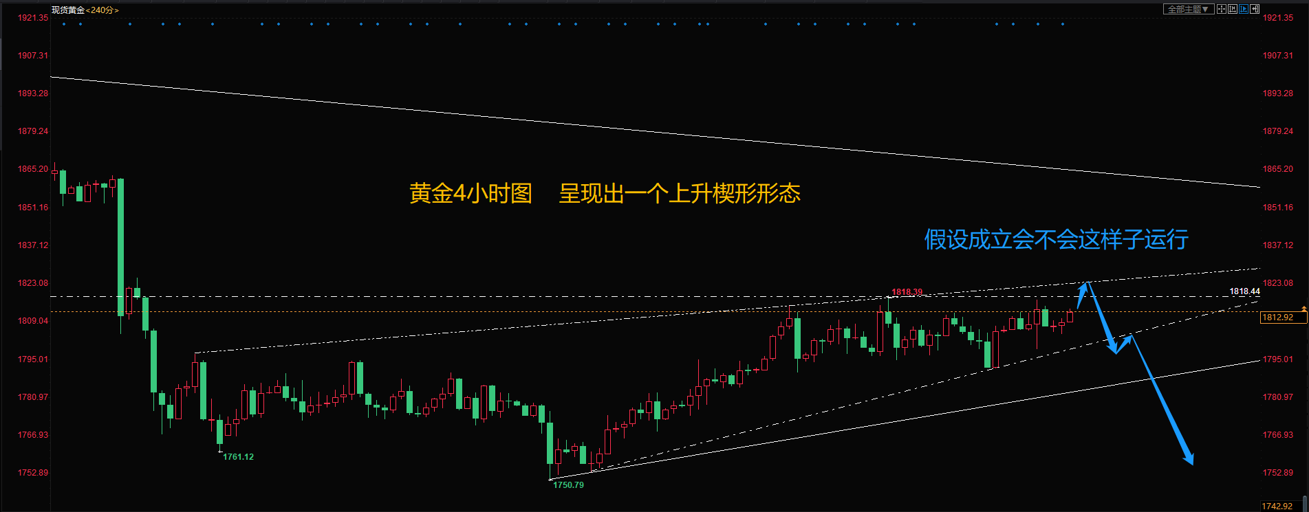 下面的图片中蓝色的假设走势是否成立,我们让市场来验证,只要能够给予是一个楔形的完整结构就OK啦。