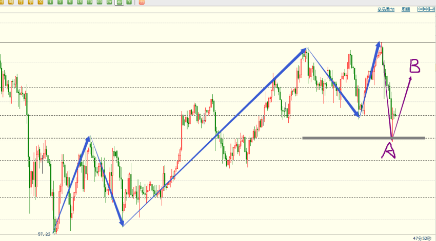 05-20 09:30原油昨日反弹都没出现一路向下不回头,可以说是没有给到做空的机会,这就是原油的本色疯起来连自己也害怕!不过也打破了近期的盘整上行格局,说明回落调整已经出现了,既然出现意味着后期要保持一个偏空的思路。整体来看这波下行已经5美金,算是回落的第一波差不多了,因为昨晚已经触及到了黄金分割50%的位置,今天就要具体观察此位置能否企稳,一旦探底回升说明前面的A浪下跌已经结束,短线进入到反弹B浪的节奏中。日内如果二次下探不破昨晚低点61.97会考虑多单进场博取一波反弹上行走势。(图灵波浪理论)图片为原油4小时图