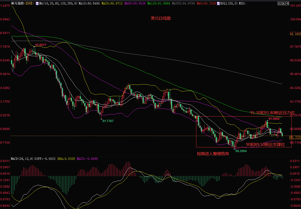 美元从日线级别看,本周先扬后抑,周内宽幅整顿,从整体看美元进入到了一个矩形整理格局,大跌大涨短期很实现,指标布林带走平,MACD虽死叉,但是依然在0轴附近,60/20/10均线交织运行。下周重点关注90和89.50附近的支撑位,以及91.30和91.80附近的压力位,操作上依然是高抛低吸。不过最近英镑呈多头运行,欧元即将到了重要压力位。澳元和纽元依然偏强势。(个人建议,仅供参考)