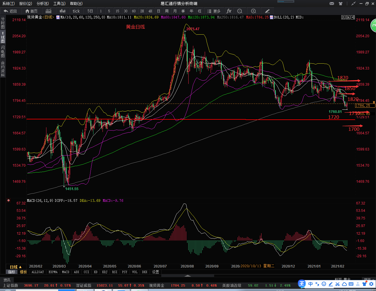 黄金从日线上看,本周收三根阴线,一根十字星线和一根小阳线,整体呈现先跌后企稳的格局,布林带三轨朝下运行,MA10均线下穿MA20均线交死叉下行,K线运行于布林下轨附近,MACD快慢线呈死叉后缓慢下行;黄金4小时走出一根小阳线,且前面有一个大阳线形成企稳信号,指标MACD一小时和两小时形成共振反弹。整体看黄金虽然是在空头的格局当中,但是同时不能忽视反弹,下周一比较关键,若是继续收阳的话,那么一波反弹就开启了。我们下周关注的重点支撑位是1750,1720,1700附近这三个位置,这三个位置到了若能有效企稳都是一波做多的机会,上方压力位1820,1850,1870,三个位置都可以做空,盘中短线会以短信的方式通知大家。(个人建议,仅供参考)