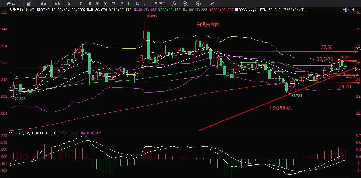 现货白银从日线图看,上周呈震荡走势,日线虽一度突破布林带上轨,但是最终在26.643遇阻后下跌,不过目前依然运行在10天均线之上,且指标MACD金叉上行,红色动能减弱,且日线运行在上涨趋势线(25.80-60)之上,同时这个位置也是比较重要的,前面黄金我们也是分析了,此位置是本周重点关注的。整体看白银依然是出于多头之上,虽然回调修整指标。若是有效站稳上涨趋势线继续低多为主;若是有效跌破的话反弹做空为主。本周重点关注上方压力位26.70,27.50以及下方支撑位25.30,24.70。(个人建议,仅供参考)