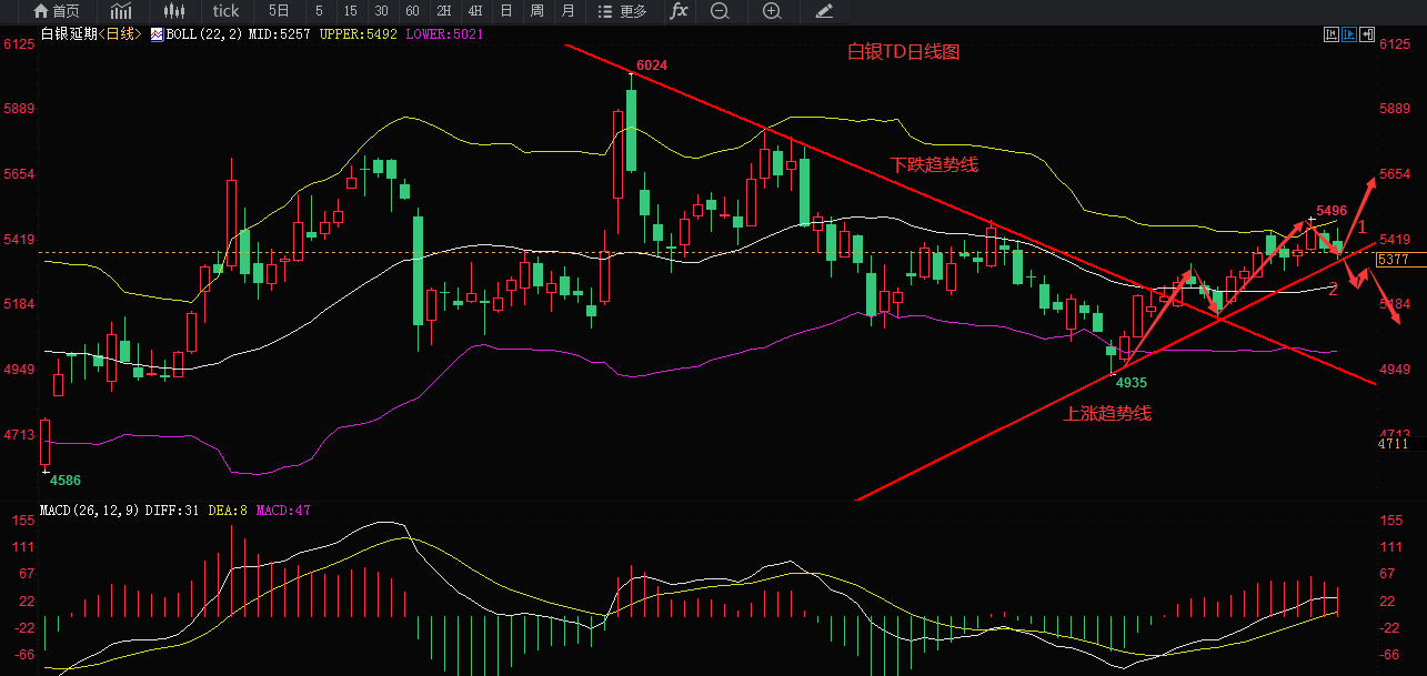 白银TD技术面依然参考现货白银,我们要注意的就是本周的重要支撑位5250和5150附近,两个位置能企稳的话可以做一波多单。上方压力位5500附近,以及5650附近,其中5650附近是做一波空机会,目标200-400点,止损80点。(个人建议,仅供参考)