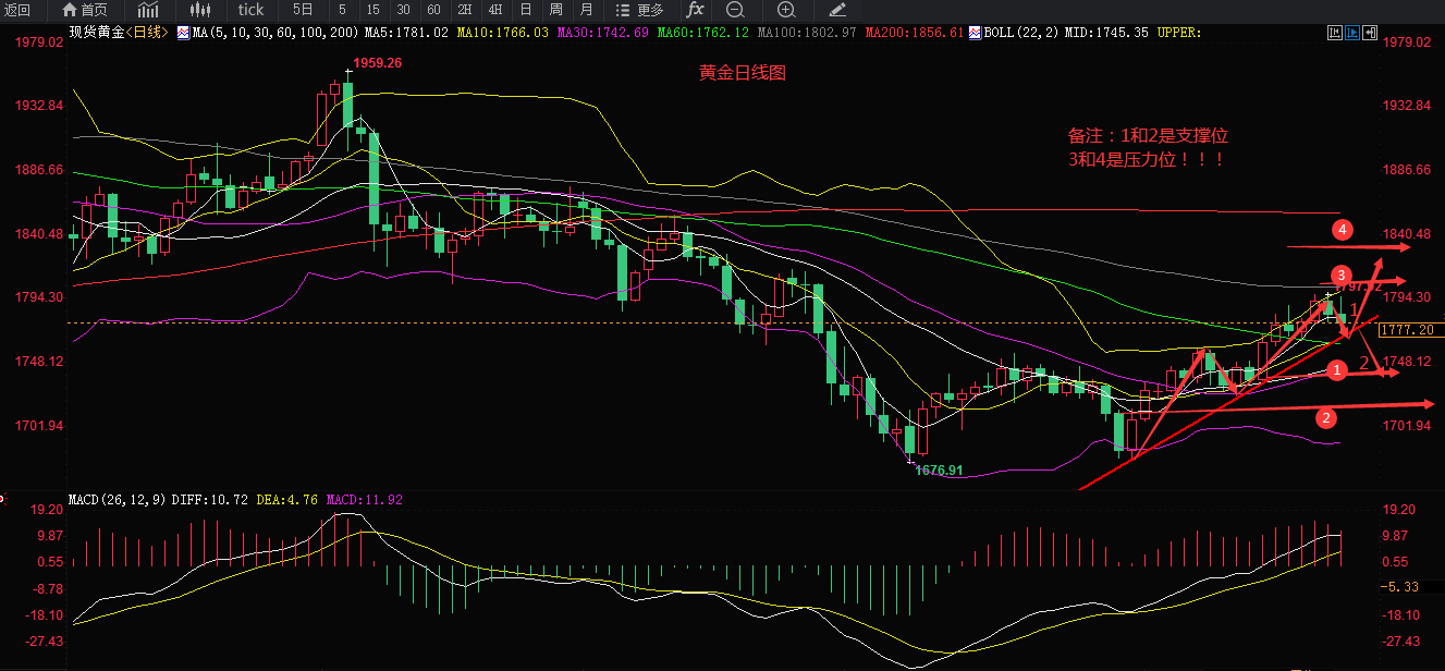 黄金从日线图看,上周行情先涨后跌,短期1798-1800成为重要阻力,日线收三阴二阳线,目前到了上涨趋势线(1770附近)位置,此位置比较关键,若能获得有效支撑的话行情继续走第五浪上涨,下一个压力位1800-1805,终极目标在1840-45;若是跌破这个上涨趋势线的话,那么短期行情继续走回调,下一个支撑位在1745-35,以及1715-10.,指标看60天均线也是比较重要,MACD在0轴上方运行,红柱动能减弱,但是依然偏强势,整体看短期虽然回调,但是没有改变多头趋势,所以下周一将成为关键,大家要注意一下。(个人建议,仅供参考)
