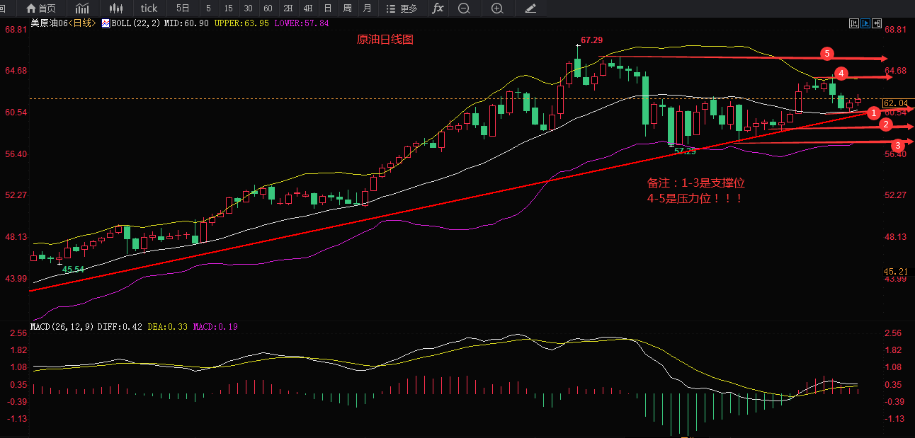原油从日线图看,上周冲高遇阻回调,上方 压力位正好是布林带上附近,且布林带缩口,整体进入整理阶段,上方压力位在64附近,本周若是不能有效突破继续回调,若是有效突破的话将有望测试64附近的压力位,下方注意的就是此上涨趋势线(60.80-60.50)的位置,此位置回调不破,短期依然偏多走势,若是跌破此位置,将继续回调,下方支撑可以参考59附近以及57.50附近不过目前日线仍运行在布林带中轨上方,且指标MACD在0轴上方,所以短期依然是偏多走势。(个人建议,仅供参考)