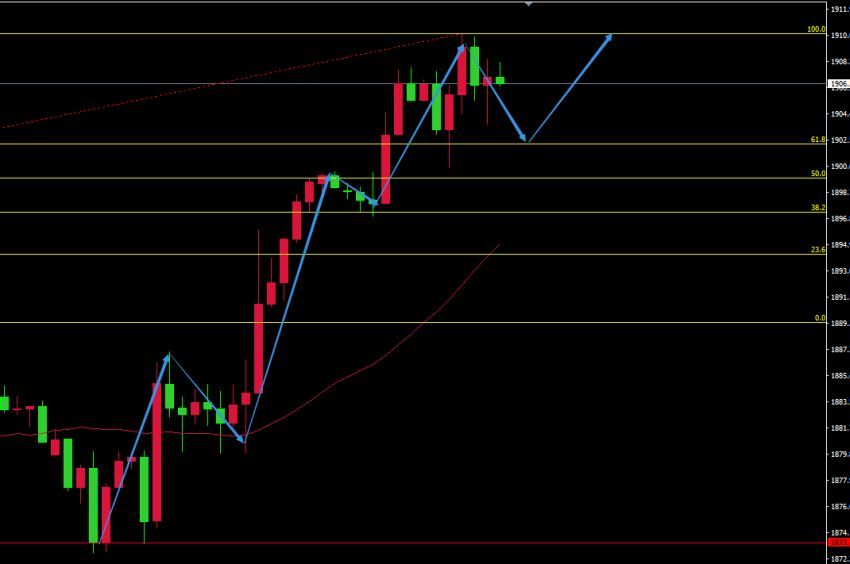 05-26 19:07周二黄金在美盘期间强势上涨突破了重要的阻力位1890,并快速上攻。今日亚盘间,黄金企稳在1900关口上方,在黄金突破1900后,市场做多的热情好像增长了好多。亚盘我们给出了1902做多策略获利不少,从消息面看市场认为通胀影响比目前预期的要严重多,所以导致资金再一次冲进像黄金一样可以对冲通胀的产品。从技术图表上看,值得注意的是黄金能否守住1900的大关,黄金逐步进入超买区,可能会出现必要的回调,这点需要朋友们提高警惕。黄金处在主推动浪结构当中。短线黄金参考点位,黄金1904~1903考虑做多,风控点位1899下方,目标位1911~1914。图片是黄金1小时k线图