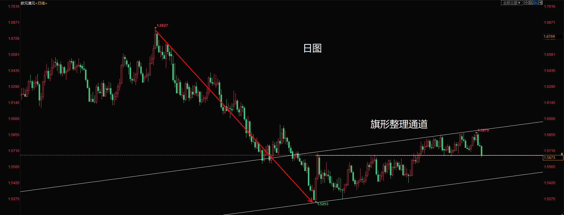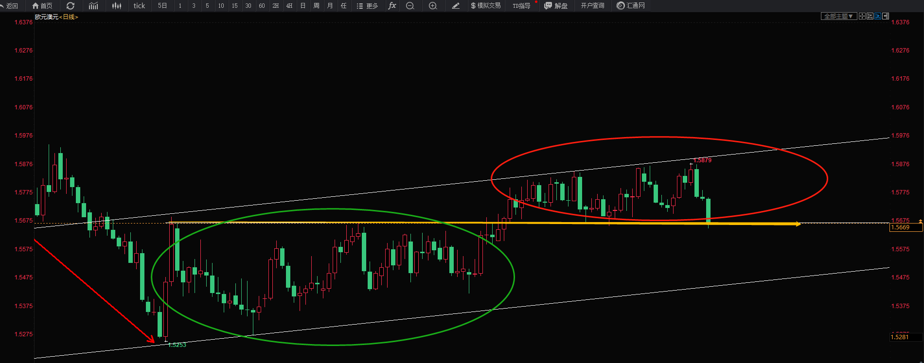 3、再就是整理区水平支撑价格1.5670附近的支撑跌破。则会下跌寻找通道的下沿1.5456。