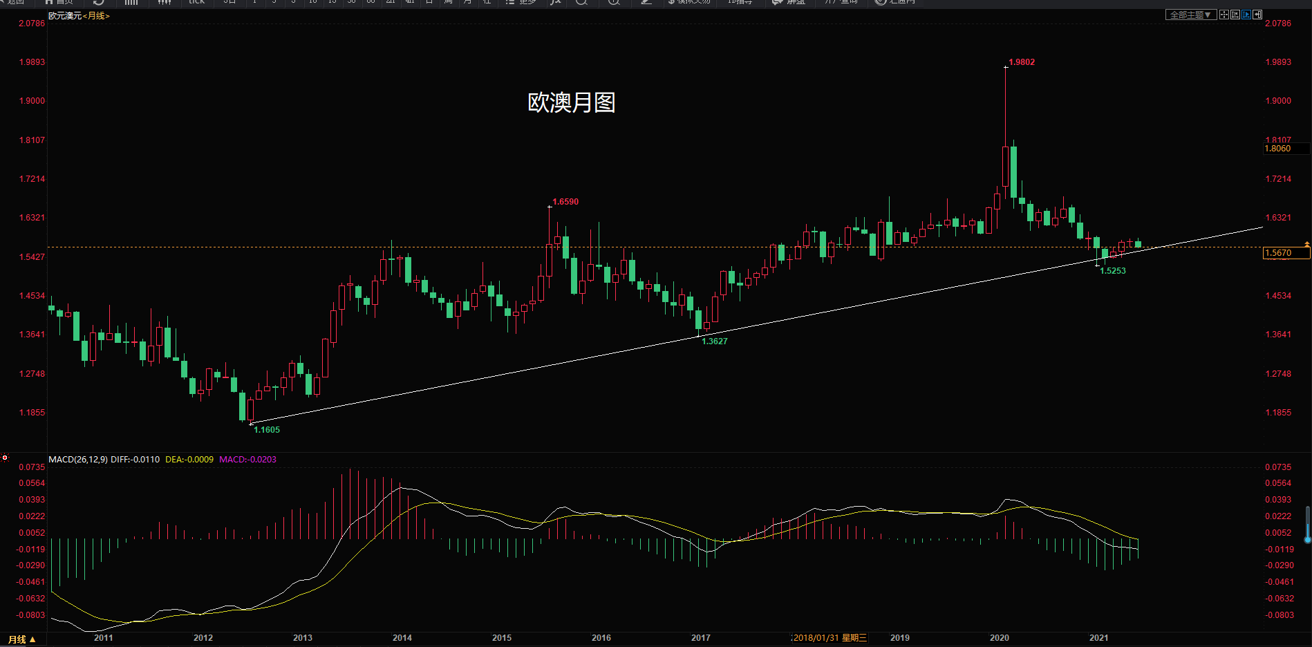 4、1.5456一旦跌破,则会把下降旗形的形态完成,价格会继续下跌。会破掉月图上的支撑。