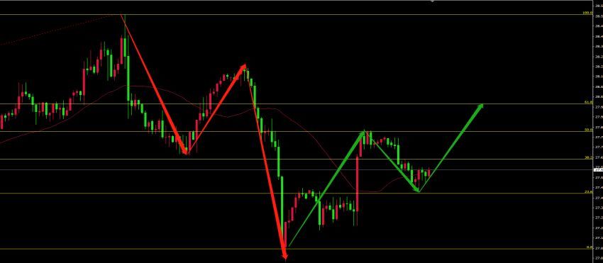 06-07 18:58亚盘间白银的走势强于黄金,技术形态更加的明晰一些,白天持续走弱,白银需要关注27.45附近的支撑,这一点位我们日内也是经过了测试,支撑是有效的,图灵群中也给出这一线做多的策略。从图灵波浪理论上看,白银和黄金一样处在反弹第三浪的走势中。白银美盘短线建议27.45~27.5做多,风控点27.25下方,目标位27.8~28.1区域。图片是白银1小时k线