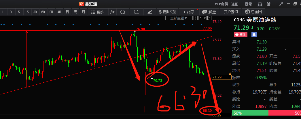 07-16 14:57原油反弹无力 下跌是大势所趋人心所向。从-40多美元 一路到76.98 史无前例 我们通过分析有理由认为回落是符合行情运行规律的。跌破70.78后 下方的空间将被打开 目前可先看66.30附近的筹码对称形态请看下图